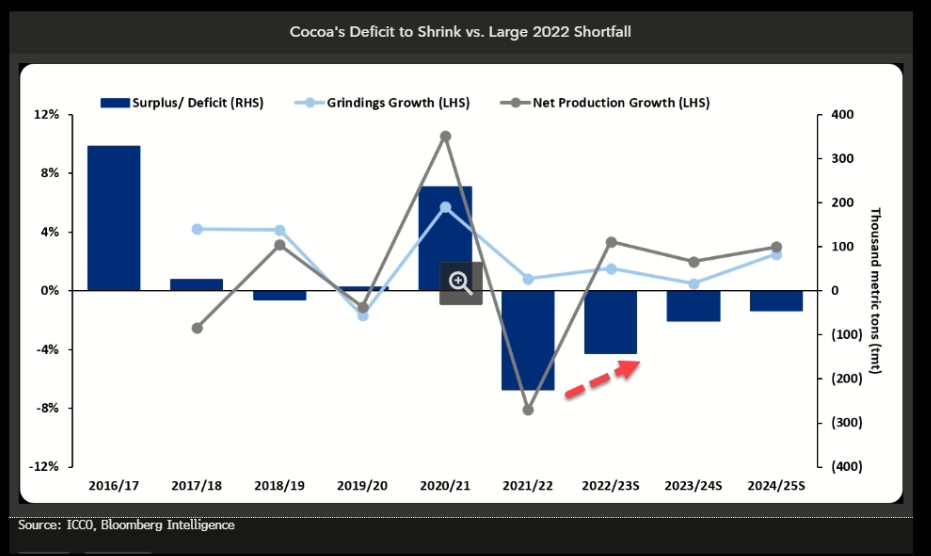 Gráfica 3. Evolución de las variables para las temporadas de cacao desde la 2016-17 hasta las proyección 2024-25: en barras azules el exceso y deficit de la oferta medida en toneladas métricas; En linea gris , el incremento porcentual de la producción; y en linea celeste, el crecimiento porcentual de las actividades de molienda de cacao. Fuente: Bloomberg.