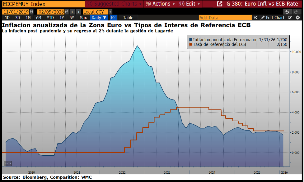 Para comprender la magnitud de este posible cambio, es imperativo analizar la trayectoria de Christine Lagarde, quien asumió la presidencia del BCE tras liderar el Fondo Monetario Internacional y haber servido como ministra de Finanzas de Francia. A diferencia de sus predecesores, más cercanos al rigor académico de la banca central pura, Lagarde ha destacado por su capacidad de comunicación política y su habilidad para forjar consensos en un Consejo de Gobierno a menudo dividido. Bajo su liderazgo, la institución navegó por la crisis sin precedentes de la pandemia, implementando el Programa de Compras de Emergencia frente a la Pandemia (PEPP) para evitar la fragmentación de la deuda soberana, y posteriormente gestionó el ciclo de endurecimiento monetario más agresivo del banco para combatir una inflación que llegó a superar el diez por ciento en 2022. (Véase gráfica 2.1). Actualmente, con la inflación retrocediendo hacia el 1.7% y un crecimiento económico que, aunque modesto, muestra signos de resiliencia, muchos analistas consideran que Lagarde ha llevado a la institución a un "nirvana" para banqueros centrales.