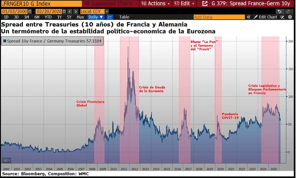 Francia es la segunda economía de la Unión Europea y, tradicionalmente, ningún presidente del banco ha sido nombrado sin el beneplácito de París; por ello, Lagarde buscaría que Macron, antes de dejar el Elíseo, y el canciller Merz, actúen como los principales arquitectos de la transición. Esta estrategia de “blindaje institucional” tiene un precedente inmediato en la reciente renuncia anticipada de François Villeroy de Galhau como gobernador del Banco de Francia (el pasado 09 de febrero), una maniobra diseñada específicamente para que Macron nombre a un sucesor alineado con la visión pro-europea antes del ciclo electoral.