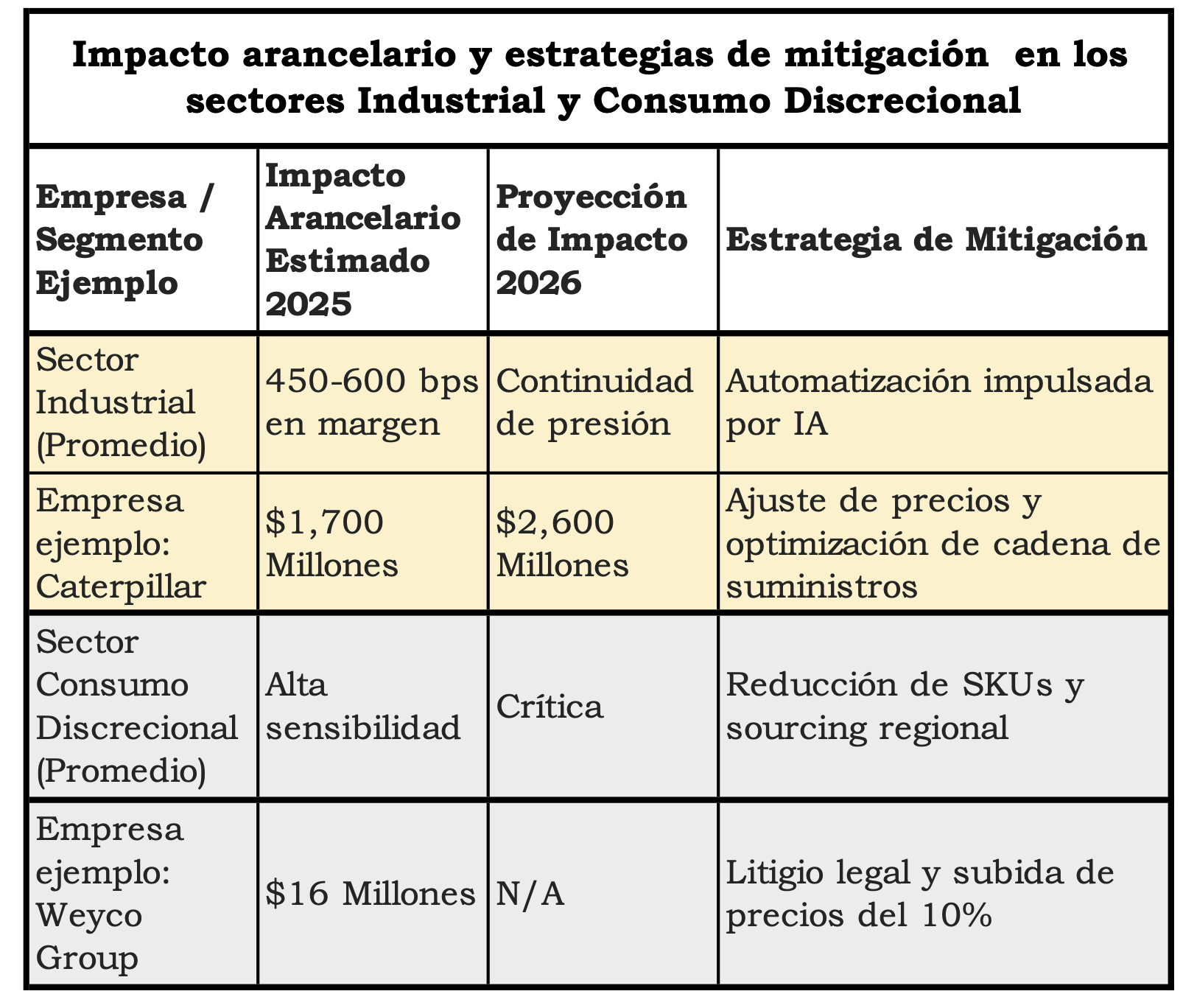 Gráfica 2.4 Impacto arancelario y estrategias de mitigación en los sectores Industrial y Consumo Discrecional. Fuentes: Caterpillar (CAT) Q4 2025 Earnings Call Transcript./ Weyco (WEYS) Q4 2025 Earnings Call Transcript . Composición: WMC