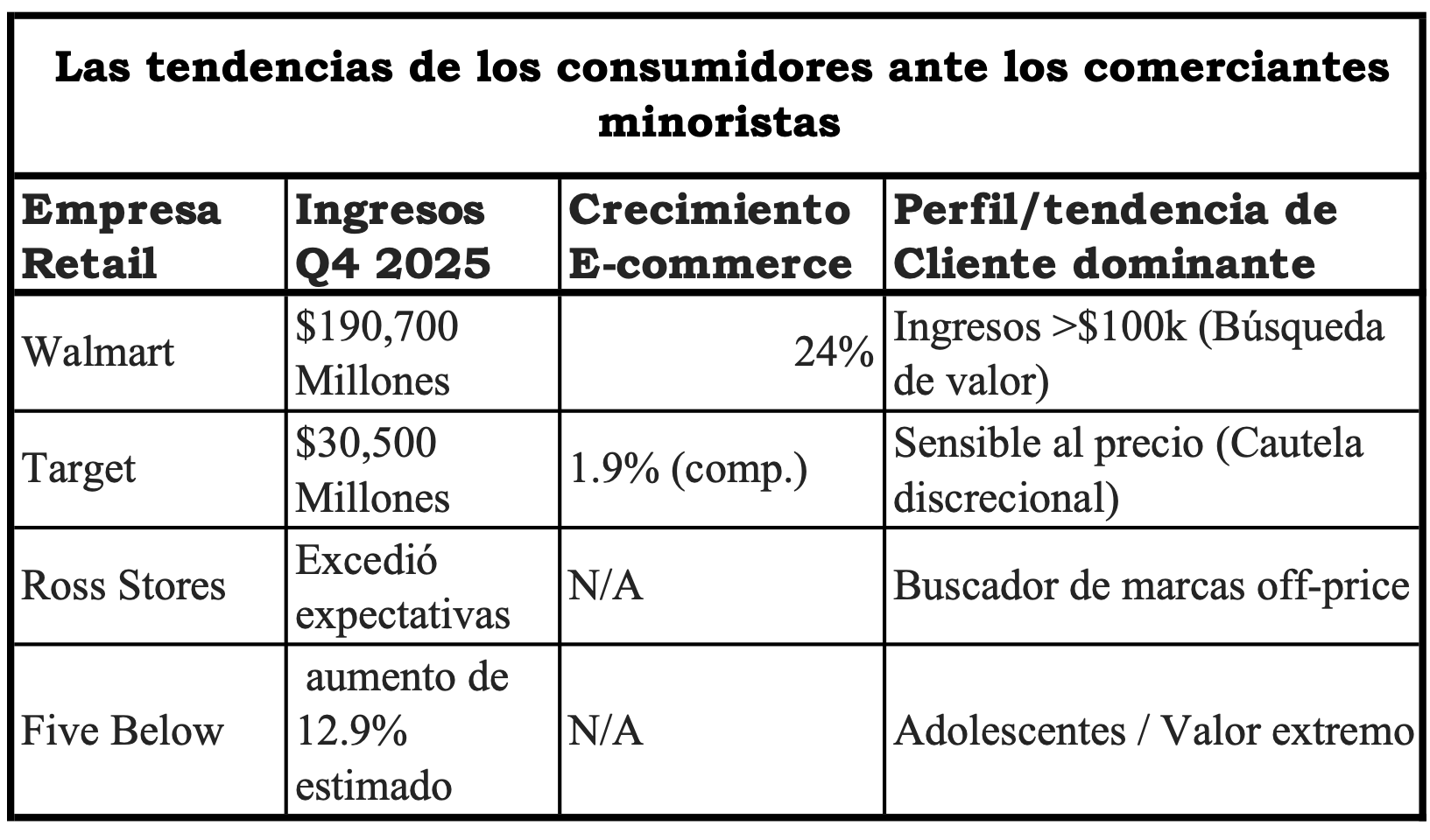 Gráfica 2.5 Las tendencias de los consumidores ante los comerciantes minoristas. Fuentes: Walmart furthers gains with higher-income shoppers - Retail Dive, / Target Corporation Reports Fourth Quarter and Full-Year 2025 Earnings / Q4 2025 U.S. Retail Scorecard – Update March 4, 2026 | Lipper Alpha Insight , Composición: WMC