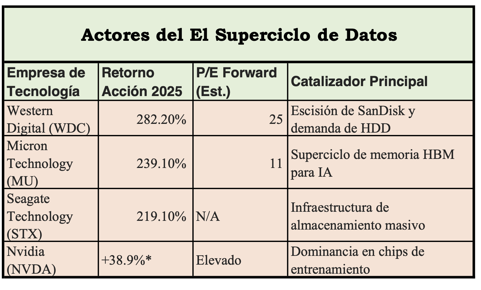 Uno de los hallazgos más sorprendentes de la temporada ha sido el rendimiento excepcional de las empresas de almacenamiento y memoria, que superaron a muchos nombres destacados de IA en rentabilidad. Western Digital, Micron Technology y Seagate lideraron los mejores valores del S&P 500 en 2025, con rendimientos que, en varios casos, superaron el 280%. Este fenómeno se debe a una “tormenta perfecta”: la escasez global de memoria NAND y de discos duros de alta capacidad se combinó con una demanda explosiva para el entrenamiento de modelos de IA en centros de datos.