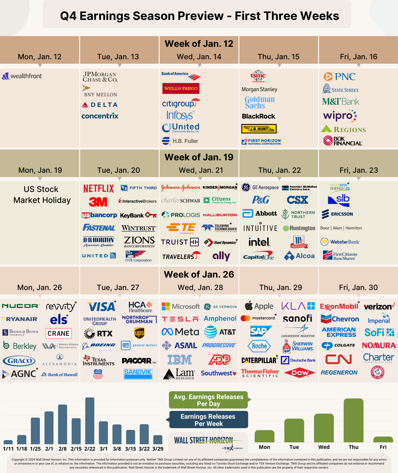 Gráfica 2.1 Temporada de Ganancias Q4 2025. Calendario de presentaciones de las primeras tres semanas. Fuente Wall Street Horizon inc.