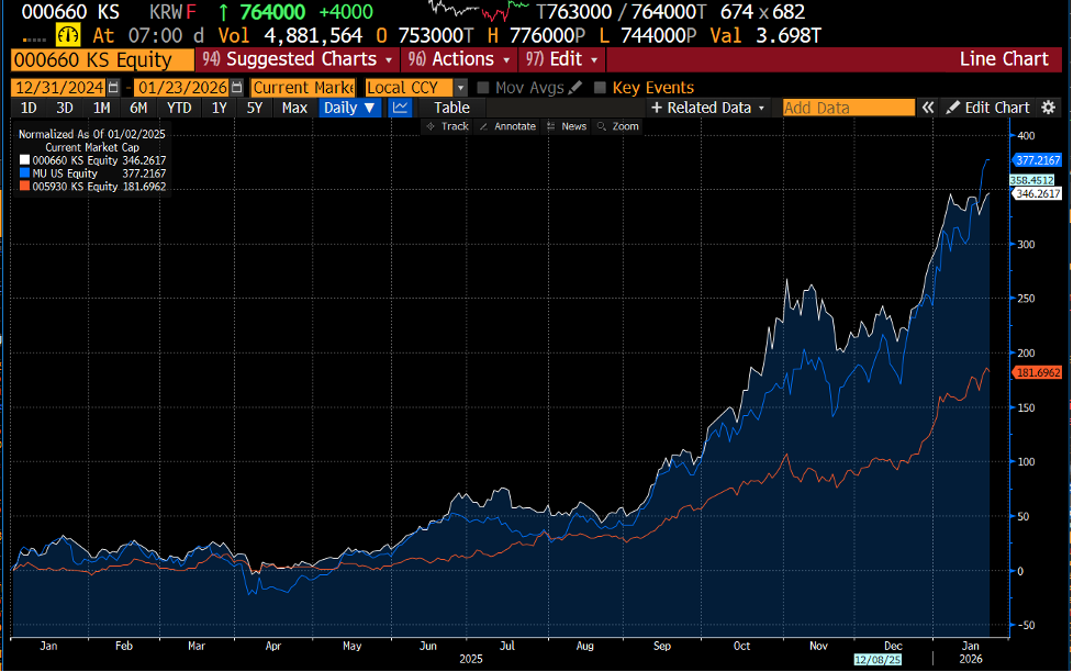 Gráfica 2.2. Crecimiento relativo de la cotización de las acciones de Samsung (linea amarilla), SK Hynix (linea violeta) y Micron (linea roja) vs el Indice de Semiconductores (SOX , linea blánca) y el S&P 500 (linea azul). Fuente: Bloomberg. Composición: WMC