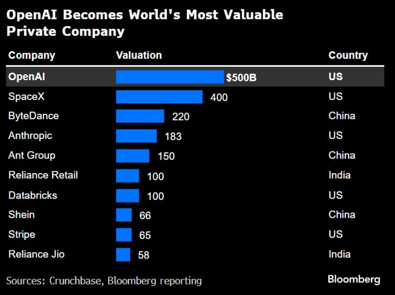 El hito más visible de la transformación de la empresa es la vertiginosa aceleración de su valoración. En octubre de este año, OpenAI cerró una venta secundaria de acciones que valoró a la compañía en $500 mil millones. (Véase gráfica 2.1)
