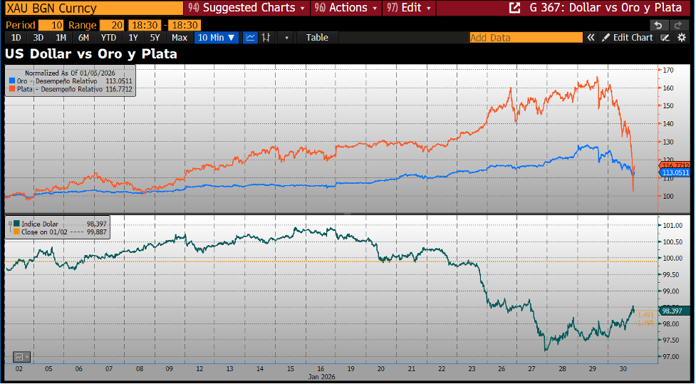 Gráfica 2.4. Panel superior: Evolución de la revaluación relativa del oro (línea azul) y de la plata (línea roja), durante el mes de enero 2026. Panel inferior: Evolución del índice de fortaleza del dólar en el mismo lapso. Fuente: Bloomberg. Composición: WMC