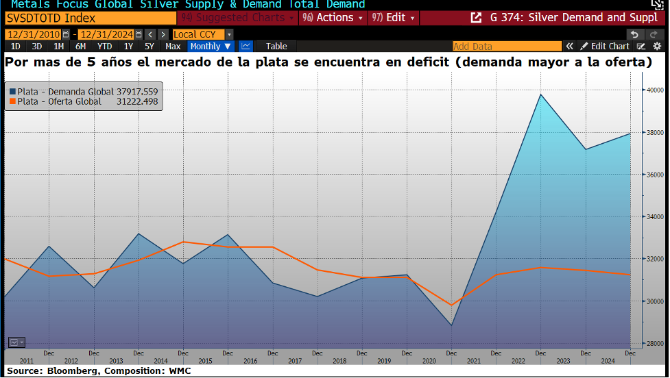 Gráfica 2.3. Mercado de la plata. Evolución de la oferta y la demanda en el lapso 2010-2024. Fuente: Bloomberg. Composición: WMC