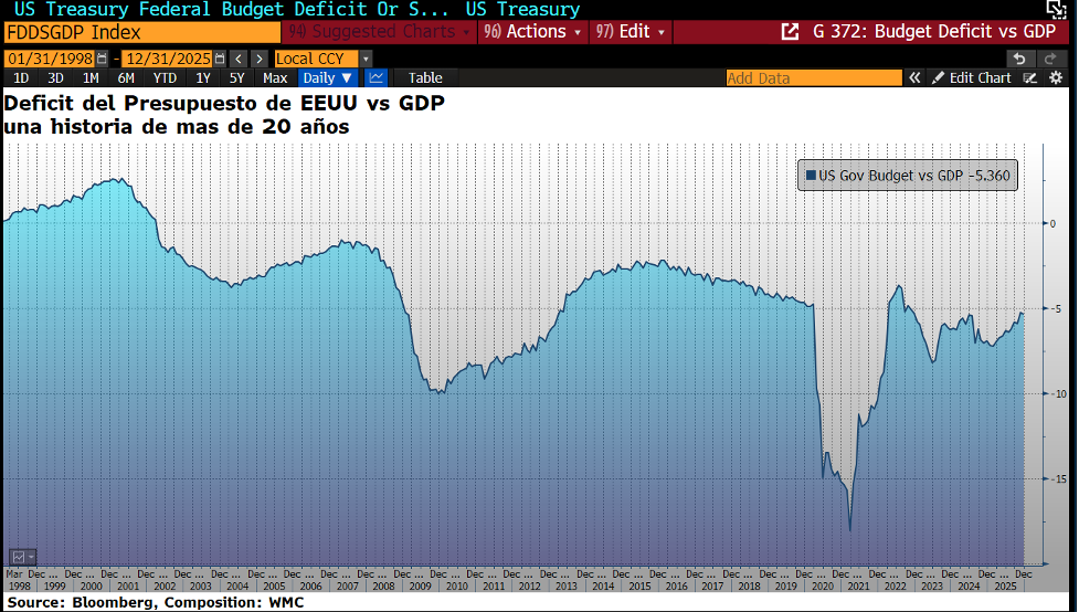 Gráfica 2.1. Evolución desde 1998 de la diferencia entre el Producto Interno bruto y el presupuesto federal de Los Estados Unidos. Fuente: Bloomberg. Composición : WMC
