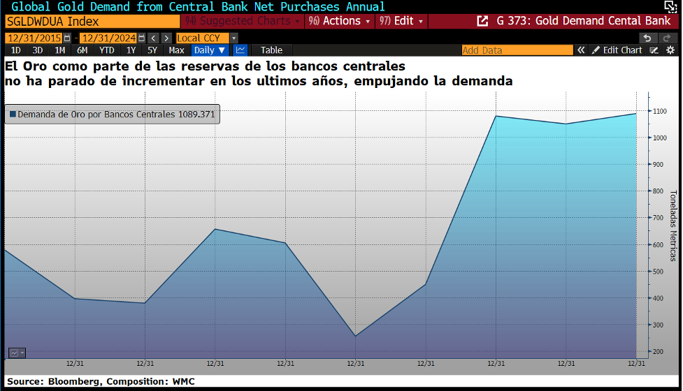Gráfica 2.2. Compras totales anuales de oro reportadas por los bancos centrales en el lapso 2015-2024. Fuente: Bloomberg. Composición: WMC