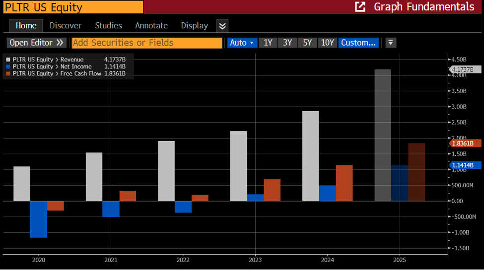 Gráfica 2.2: Palantir, evolución desde el 2020 de: en columnas blancas, ventas la empresa; en columnas azules, los ingresos netos; y en columnas rojas, el flujo de caja libre. Fuente: Bloomberg. Composición: WMC