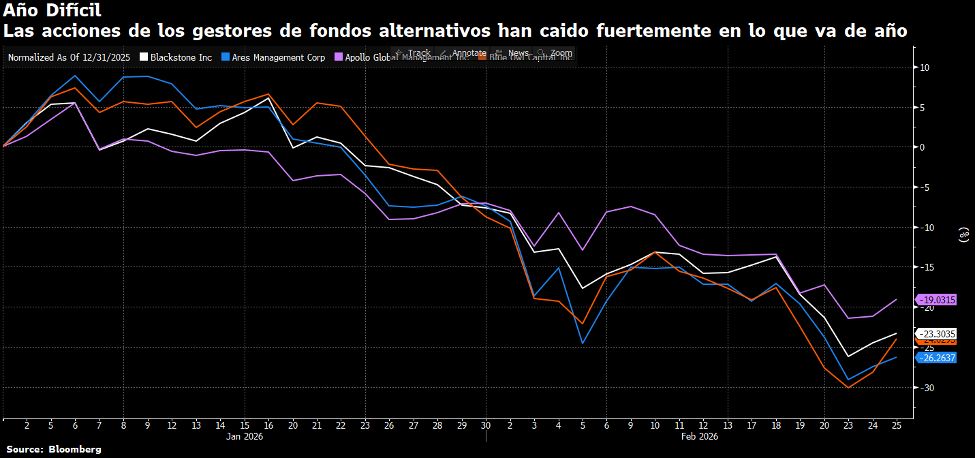 Dependerá de su capacidad para purgar los excesos acumulados durante la última década y transitar hacia un modelo de mayor transparencia y rigor en la suscripción. Las implicaciones a largo plazo para el ecosistema financiero sugieren una divergencia definitiva entre los gestores con experiencia real en ciclos de impago y aquellos que simplemente cabalgaron la ola de la liquidez fácil. La desaparición del espejismo de la baja volatilidad obligará a una re configuración de las expectativas de retorno ajustado por riesgo, consolidando al crédito privado no como un sustituto seguro de la renta fija tradicional, sino como una clase de activo compleja y cíclica que exige una vigilancia constante de los fundamentos microeconómicos Véase en la gráfica 2.4 la evolución de la revalorización relativa de las acciones de los principales gestores de crédito privado, en lo que va de año.