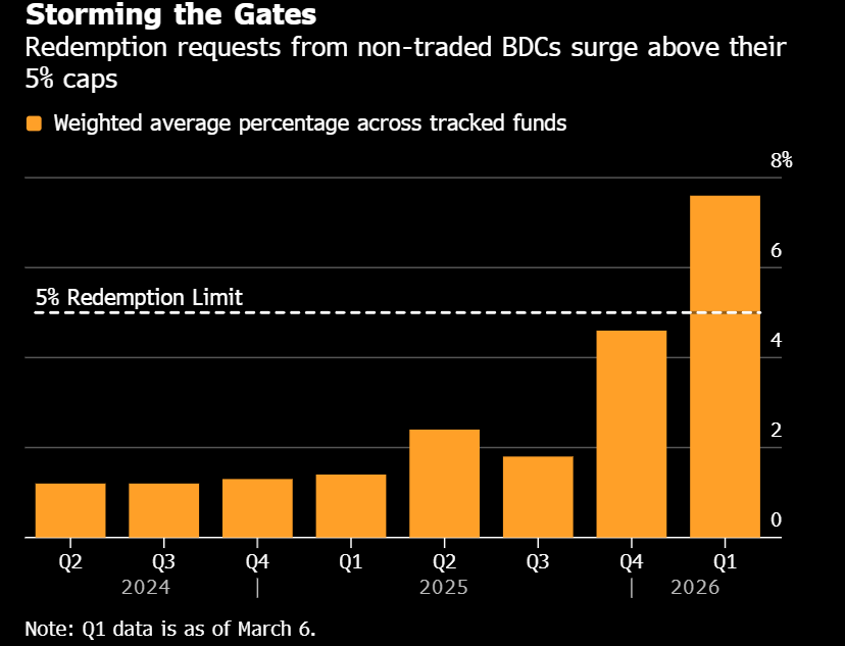 Gráfica 2.3. Evolución de las solicitudes de redenciones en los Business Development Companies desde Q2 2024, a Q1 2026. Fuente: Bloomberg. Composición: WMC.