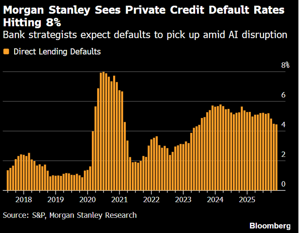 El sector del software, históricamente el pilar del crédito privado debido a sus ingresos recurrentes, se ha convertido en el epicentro de la vulnerabilidad debido a la convergencia de múltiplos de valoración excesivos y la disrupción de la inteligencia artificial. Muchos préstamos en este espacio se otorgaron basándose en el Valor de la Empresa o EV y no en activos tangibles, bajo la premisa de que el crecimiento del modelo SaaS (Software as a Service) era invulnerable, pero la revaluación de las expectativas de crecimiento ha dejado a muchos créditos con una cobertura de colateral cuestionable. Los prestamistas que se concentraron excesivamente en préstamos basados en ingresos recurrentes están descubriendo ahora que la lealtad de los clientes es volátil ante la innovación tecnológica, y que los múltiplos necesarios para recuperar el principal ya no están garantizados. Esta transición tecnológica está forzando a los gestores a realizar provisiones por deterioro que no estaban previstas en sus modelos de riesgo originales, revelando que cualquier sector tiene un punto de ruptura ante cambios estructurales profundos. Morgan Stanley ha indicado que tal ha sido la disrupción de la IA en la industria del software, que la tasa de impago de los préstamos recibidos por las empresas del sector pudiese llegar hasta el 8% (niveles no vistos desde la pandemia COVID 19). Véase en la gráfica 2.2 la evolución de la tasa de eventos de impago en el sector de crédito privado desde enero 2018.