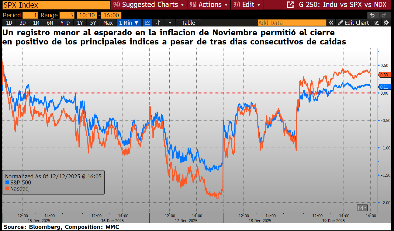 Luego de tres días de caídas, los mercados accionarios recibieron con entusiasmo la lectura de inflación más fría de lo esperado, con un aumento interanual de precios del 2,7% en noviembre, cifra que fue interpretada como una señal clara para que la Reserva Federal continúe con recortes de tasas. La recuperación también fue impulsada por el sector de inteligencia artificial con resultados favorables de Micron (MU).