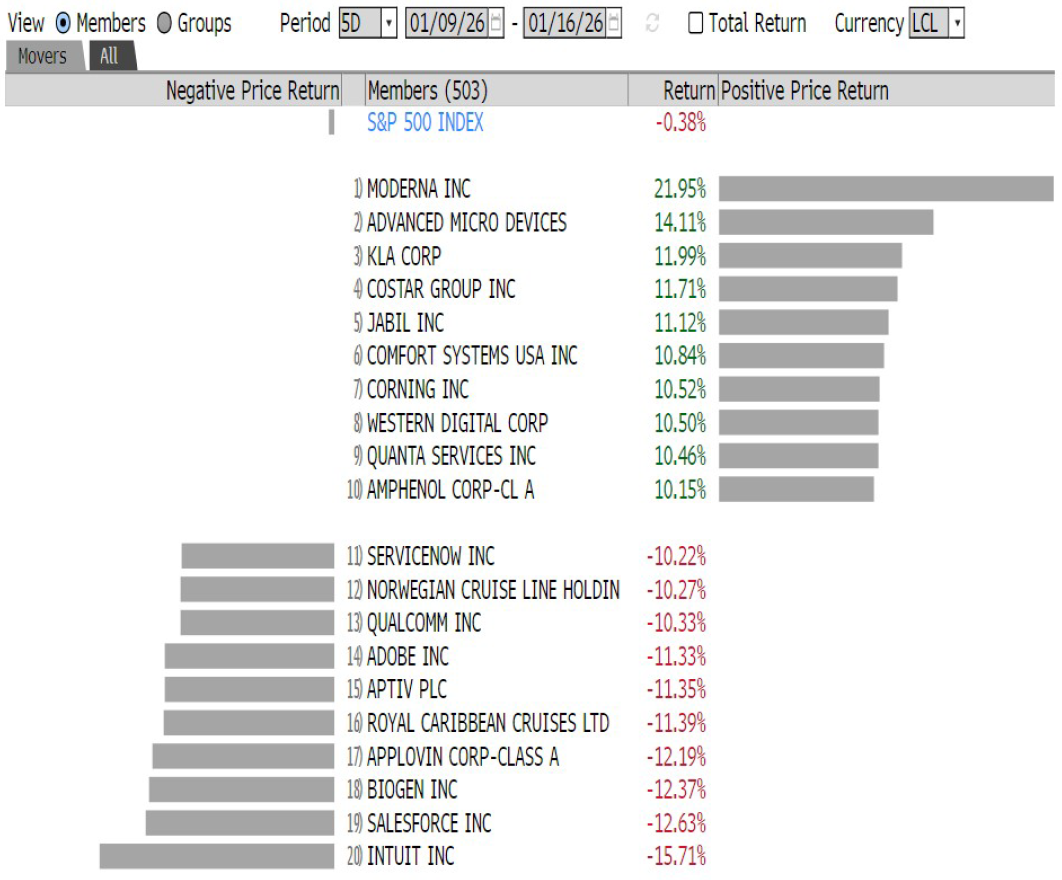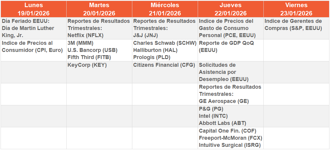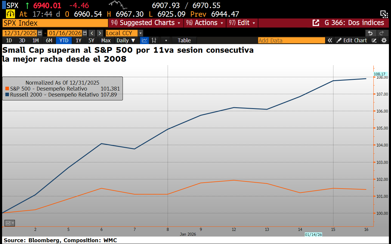 Mientras que los grandes índices sufrieron retrocesos en la semana con el S&P 500 cayendo un 0,4% y el Nasdaq un 0,7%, las empresas de pequeña capitalización brillaron con luz propia. El Russell 2000 superó al S&P 500 por undécimo día consecutivo, su racha ganadora más larga desde la crisis de 2008 (Véase grafica 1). Por el contrario, el sector bancario fue el gran lastre de la semana; gigantes como JPMorgan y Bank of America retrocedieron un 5% ante la propuesta presidencial de imponer un tope del 10% a las tasas de interés de las tarjetas de crédito. Con la temporada de resultados cobrando fuerza la próxima semana con nombres como Netflix y United Airlines, la atención se desplazará ahora hacia las proyecciones de beneficios para el resto de 2026.