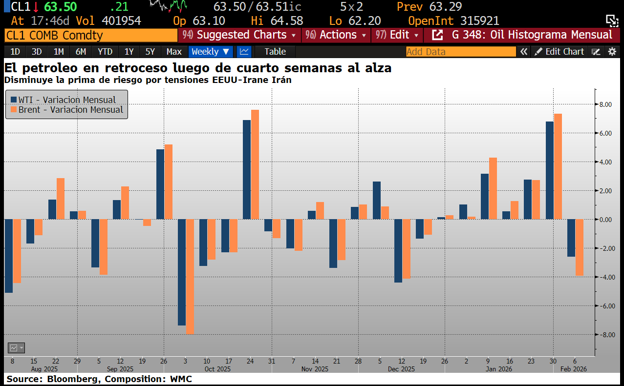 Gráfica 3. Variaciones de cierres mensuales desde Agosto de 2025 a la fecha.l WTI en barra negra. En barra naranja, los correspondiente al crudo Brent. Fuente : Bloomberg, Composición: WMC