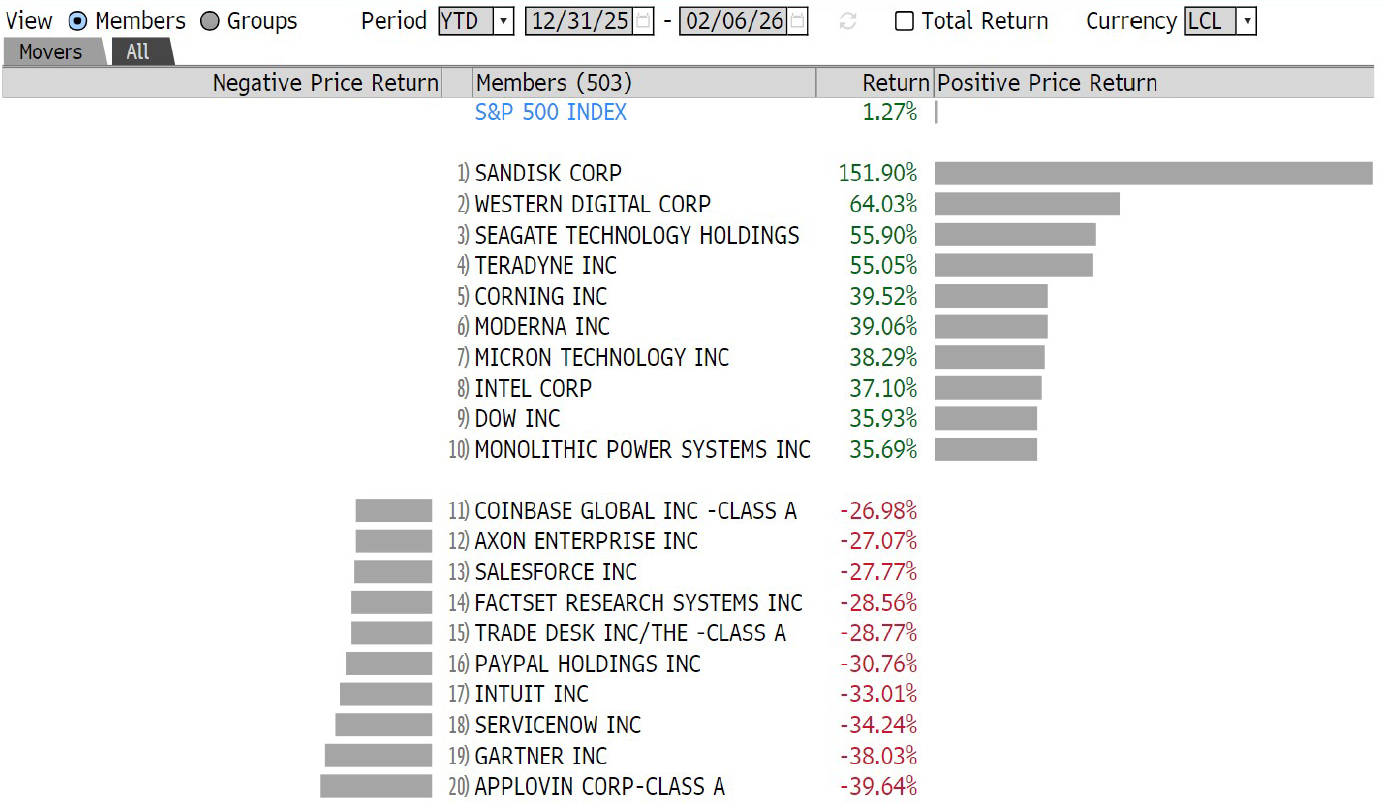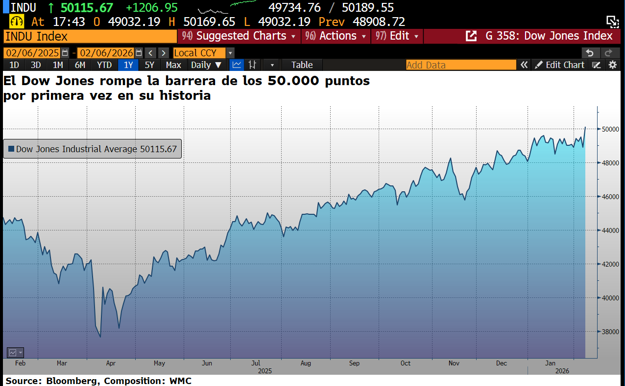 El mercado cerró esta semana con una notable resiliencia luego de varias jornadas caracterizadas por una muy alta volatilidad tecnológica. Este repunte, que llevó al Dow Jones Industrial Average a superar la barrera psicológica de los 50.000 puntos por primera vez en la historia (Véase gráfica 1). También se vivió una exacerbada volatilidad que se originó gracias a la firma Anthropic quien dio a conocer un conjunto de herramientas que hicieron temblar a los creadores de software. A esto se le unieron los reportes de dos colosos: Alphabet (GOOGL) y Amazon (AMZN), quienes proyectaron gastos de capital muy por encima de lo que el mercado estimaba.