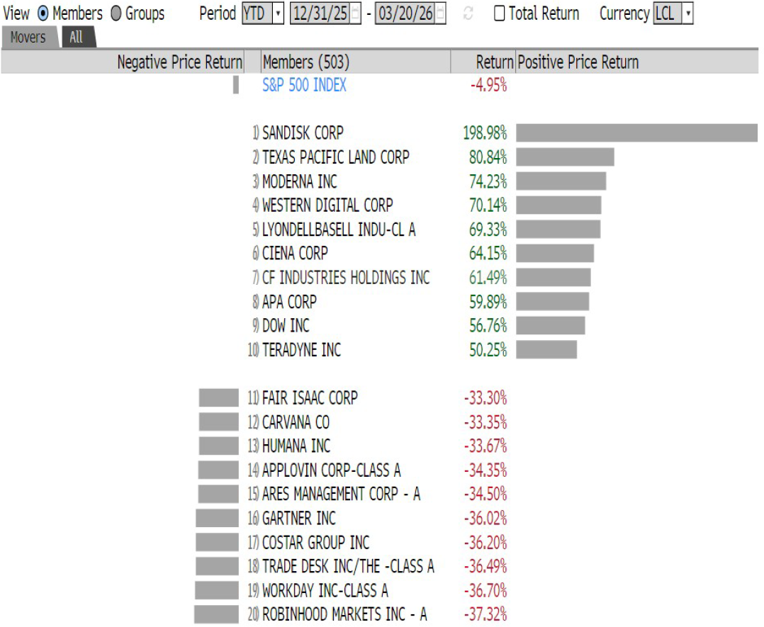 El S&P 500 ha encadenado su quinta semana consecutiva de pérdidas, una racha negativa que no se navegaba desde marzo de 2022. Este retroceso se ve agravado por la entrada del Nasdaq 100 en territorio de corrección -un descenso del diez por ciento desde su máximo reciente-, marcando su caída más profunda desde abril de 2025 (Véase gráfica 1). La escalada bélica entre Irán e Israel, junto al cierre del Estrecho de Ormuz y la posible movilización de tropas terrestres, ha impulsado el crudo Brent hasta los 113 dólares, elevando simultáneamente el índice VIX hasta los 31 puntos, evidenciando un nerviosismo sistémico en los mercados financieros globales.