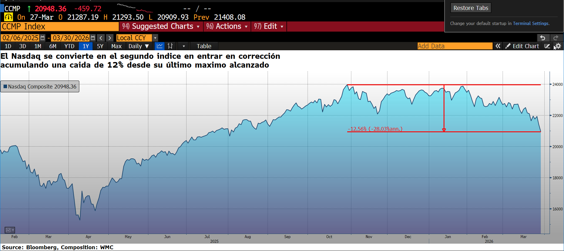 Gráfica 1. Evolución desde 06 Feb 2025 al 27 Mar 2026 de la variación del índice Nasdaq Composite. Fuente: Bloomberg. Composición: WMC.