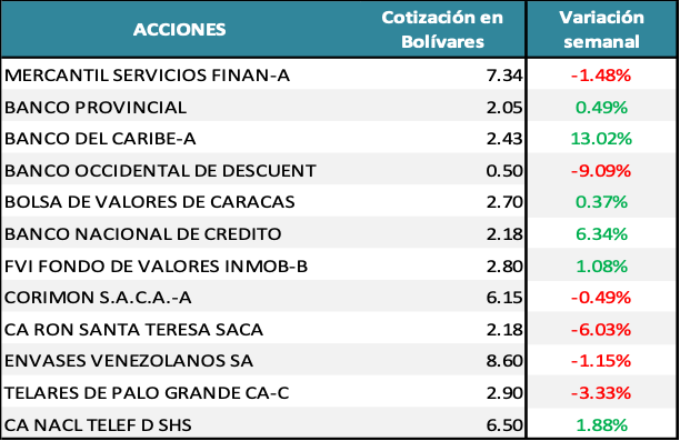 No se muestran esta semana todas las cotizaciones comparativas de las acciones de la Bolsa de Valores de Caracas debido a consecuencias derivadas de los ajustes a la nueva expresión monetaria del “Bolivar Digital”