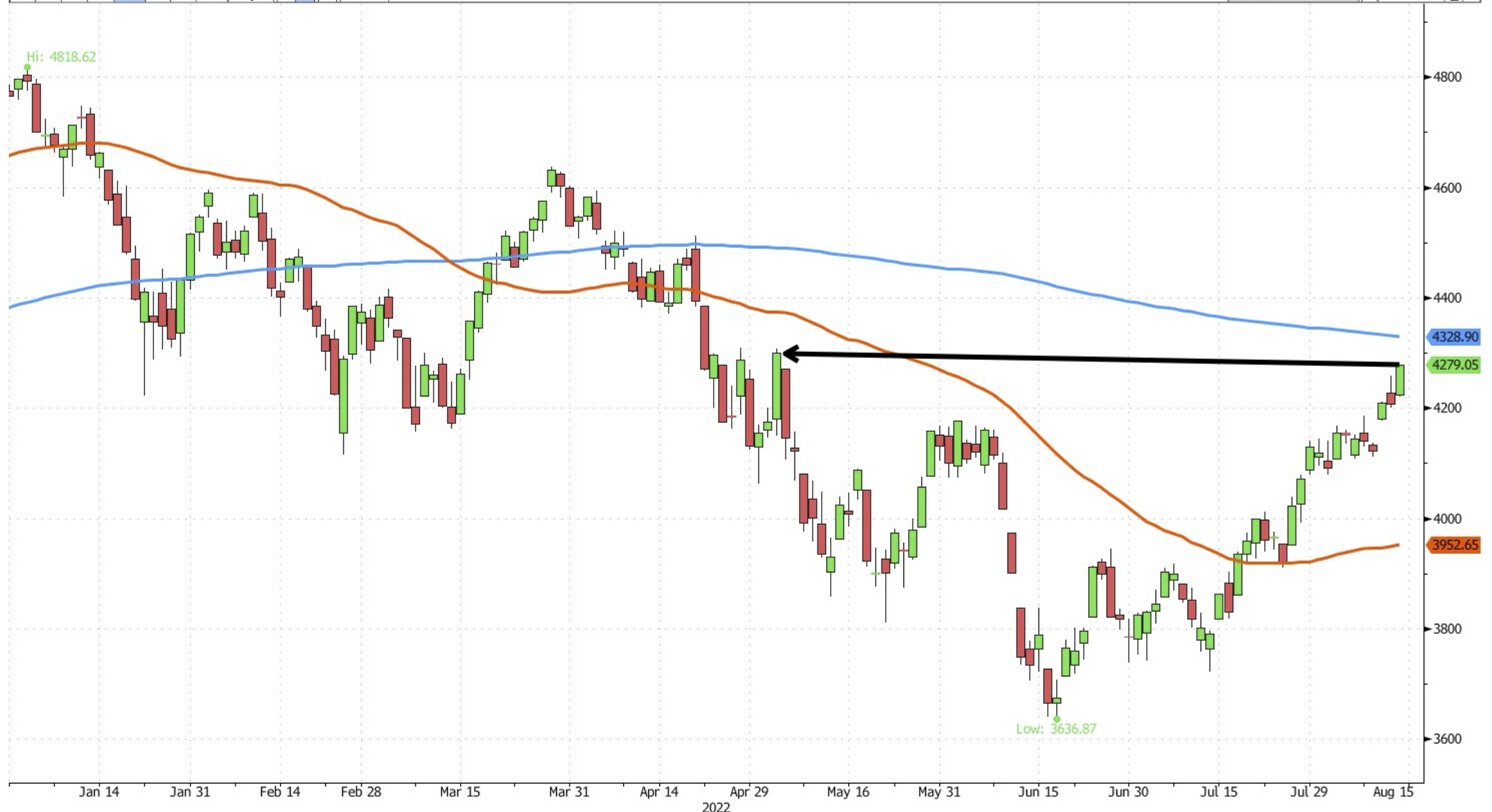 Gráfico 1: Velas japonesas diarias del índice S&P500. Las líneas azul y naranja corresponden al promedio móvil de 200 y 50 días respectivamente. La flecha negra indica que no cotizaba a estos niveles desde mayo. Fuente: Bloomberg